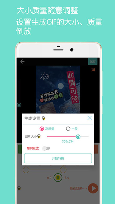 這不是簡單的轉(zhuǎn)GIF,在制作的過程中你可以隨意添加你想要的圖片,藝術(shù)文字,gif,表情到GIF中的任意位置和設(shè)置任意時間顯示。你還可以調(diào)節(jié)GIF生成的像素大小,控制幀的播放速度(變快變慢),從而控制GIF的體積大小。