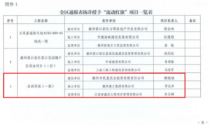3月2日上午,贛州蓉江新區(qū)表彰通報2021年贛州蓉江新區(qū)建筑施工安全“流動紅旗”競賽暨安全生產(chǎn)大比武活動開展情況,其中,星洲萃苑(一期)項目在此次評比中喜獲“流動紅旗”,并獲得贛州蓉江新區(qū)安委會發(fā)放的經(jīng)濟(jì)獎勵12000元整。