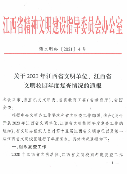 近日,江西省文明辦印發(fā)《關(guān)于2020年江西省文明單位、江西省文明校園年度復(fù)查情況的通報》(贛文明辦[2021]4號),贛州城投集團(tuán)順利通過2020年省級文明單位年度復(fù)查,繼續(xù)保留“第十五屆江西省文明單位”稱號。