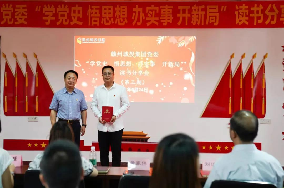蟬鳴荷香六月天,黨史學(xué)習(xí)正當(dāng)時(shí)。為推動(dòng)黨史學(xué)習(xí)教育走深走實(shí), 日前,贛州城投集團(tuán)黨委舉辦第三期“學(xué)黨史 悟思想 辦實(shí)事 開(kāi)新局”讀書(shū)分享會(huì)。集團(tuán)黨委副書(shū)記黃家偉出席并講話,集團(tuán)黨群工作部、辦公室代表,市建筑設(shè)計(jì)院、天成設(shè)計(jì)院黨支部全體黨員參加活動(dòng)。