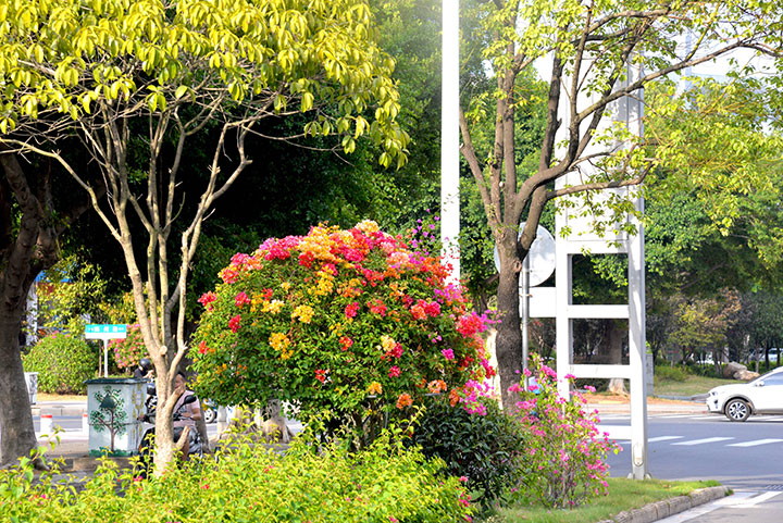 為迎接國(guó)慶,贛州生態(tài)環(huán)境有限公司在市園林環(huán)衛(wèi)管理中心技術(shù)人員的指導(dǎo)下利用多種新工藝、新手法、新技術(shù)進(jìn)行控花,以保證三角梅在國(guó)慶期間同時(shí)綻放,爭(zhēng)鮮斗艷。同時(shí),今年在興國(guó)路還種植了五彩三角梅,不同顏色的花朵在一棵三角梅植株上同時(shí)開(kāi)放,吸引了市民們的注意,引來(lái)許多市民“打卡”觀賞。