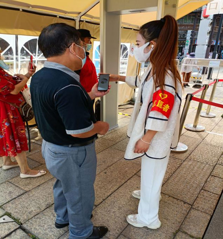 土地置業(yè)公司的志愿者在江南宋城歷史文化旅游區(qū)值班值守,引導(dǎo)廣大游客疫情期間掃碼入場,積極佩戴口罩,做好安全旅游防護措施。
